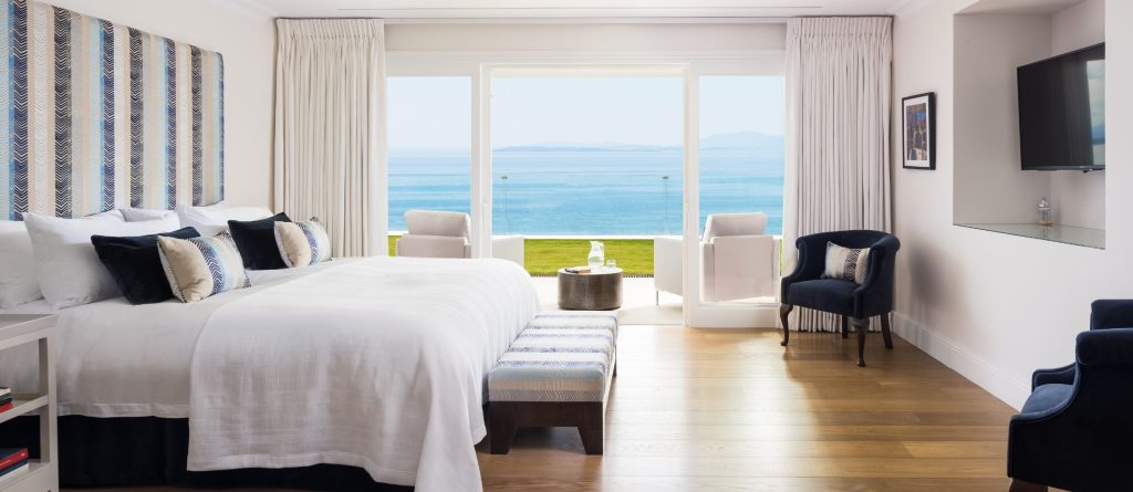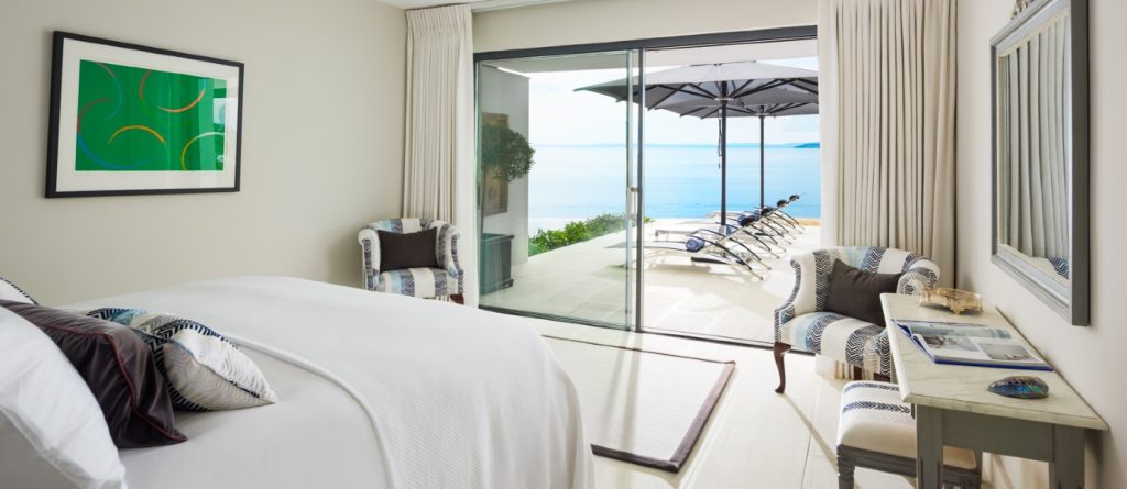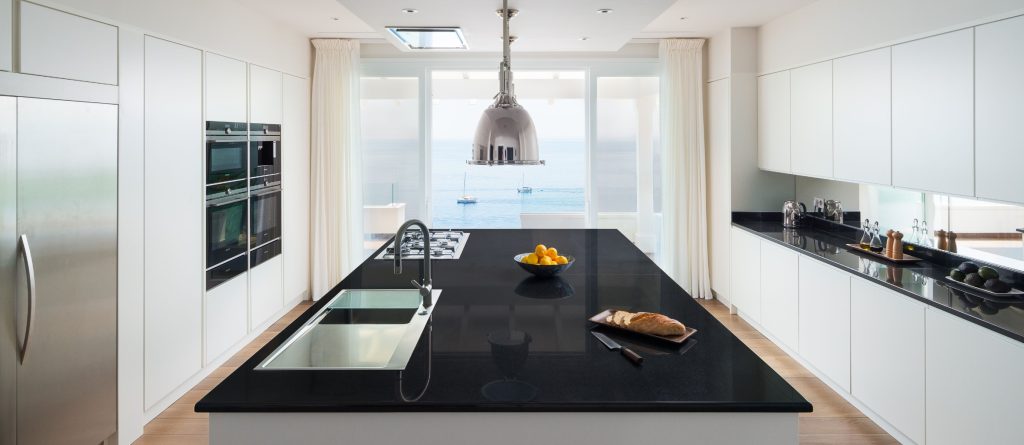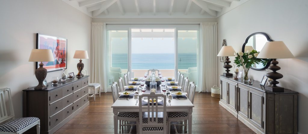 The kitchen is at the centre of the house with a beautiful granite topped island unit and sea view. The dining room has a large dining table seating 12 persons. A fireplace in this room is offset by comfortable armchairs for pre-dinner drinks.