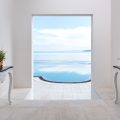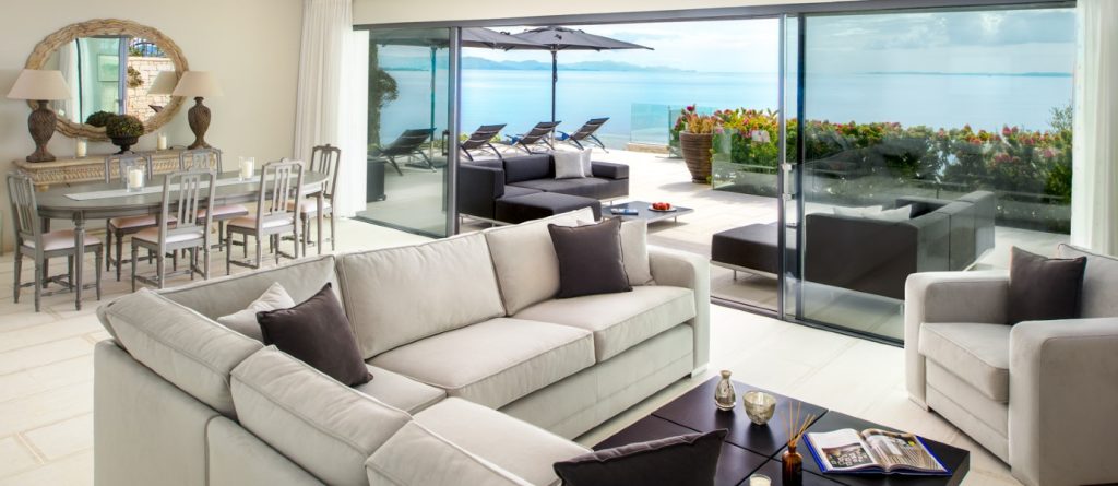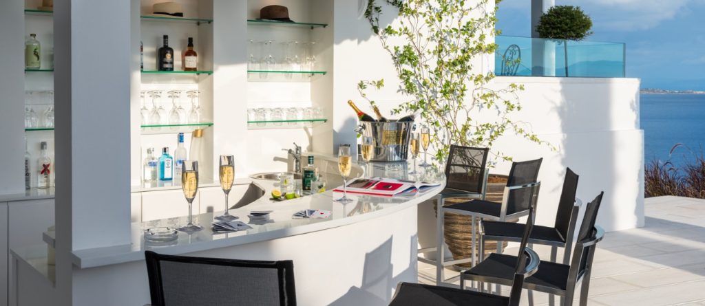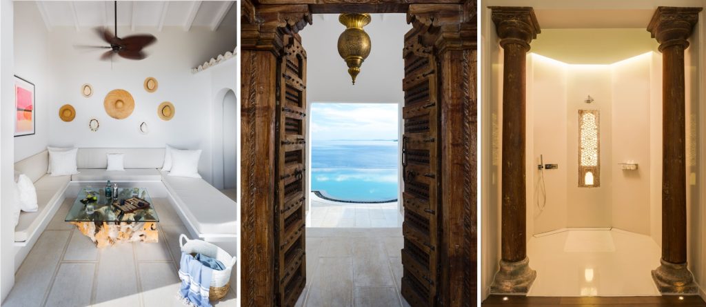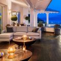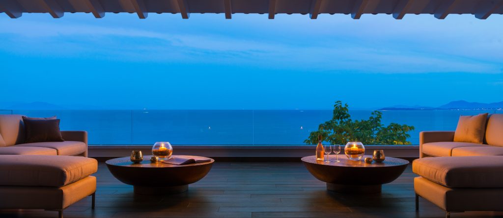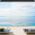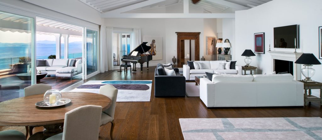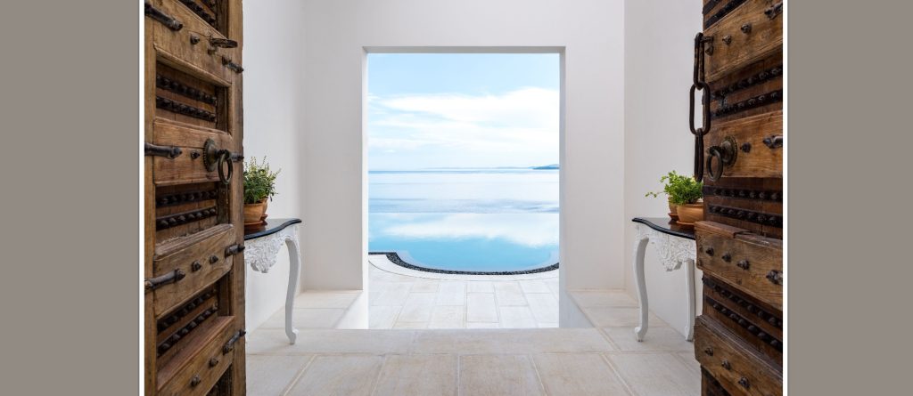 The sumptuous entrance to the villa opens into the spacious sitting room and a breath-taking view on the sea. The sea’s shade of blue surrounds the entire house by the magnificent evolution through the day, from sunrise to sunset.
