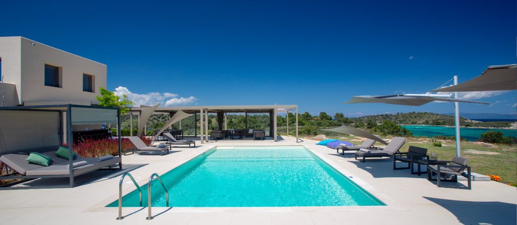 Surrounded by sandy white beaches with calm and warmed turquoise water with direct access to two of them, and a private jetty with boat at your disposal