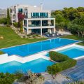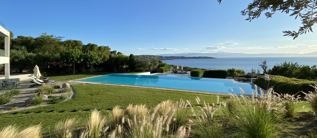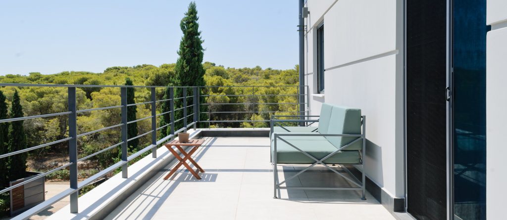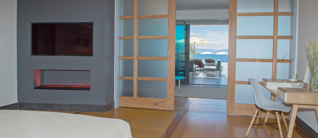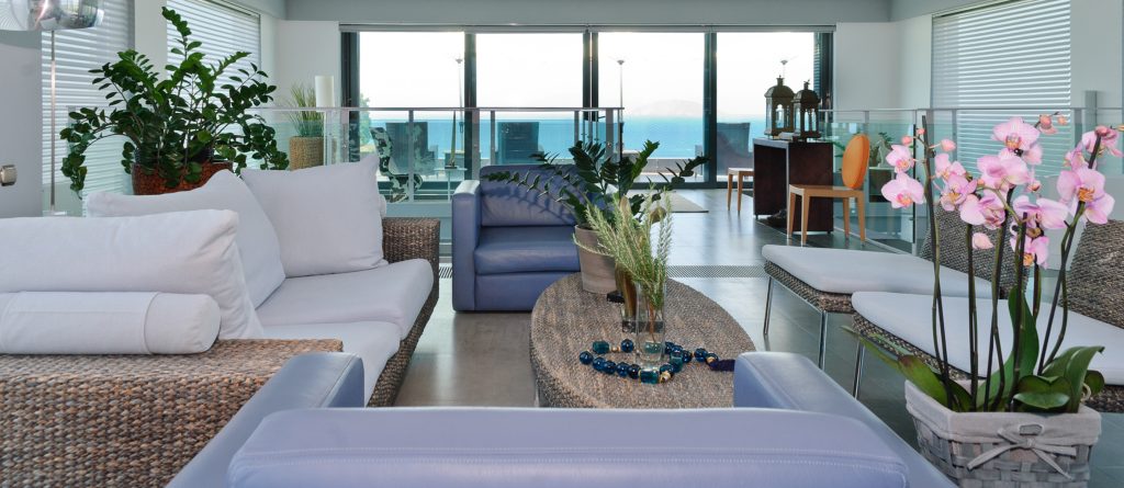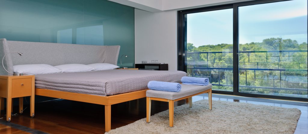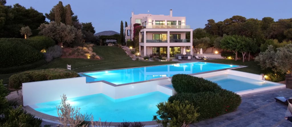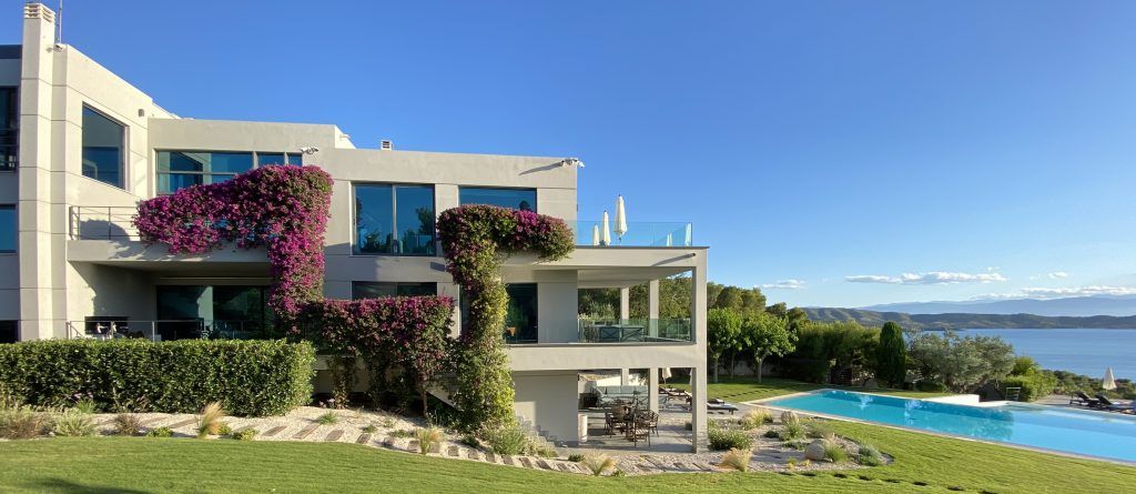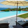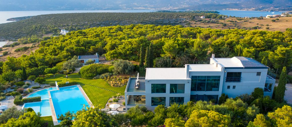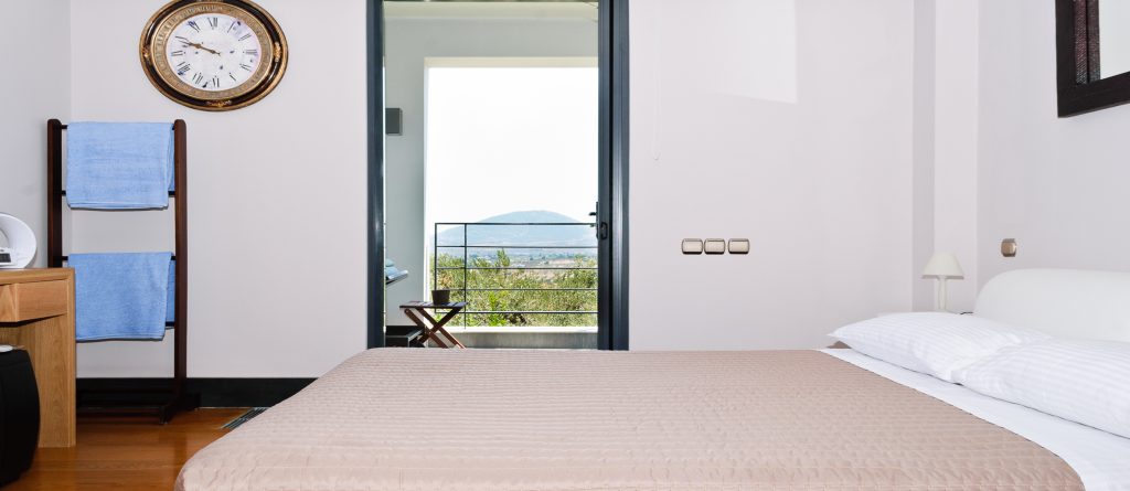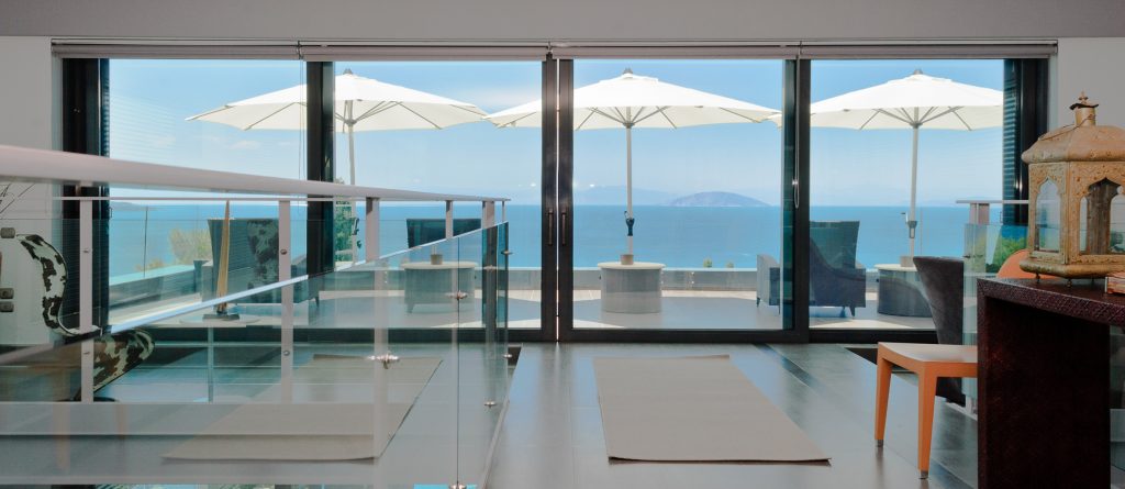 There are two spacious living rooms each with large west and south facing balconies. Floor to ceiling windows incorporate the wrap around views into the entire interior space. Sunset reaches across the 180° western seascape, over the island of Psili and onto the mountain ranges of the distant Peloponnese. North and South, views over forest and distant mountain ranges.