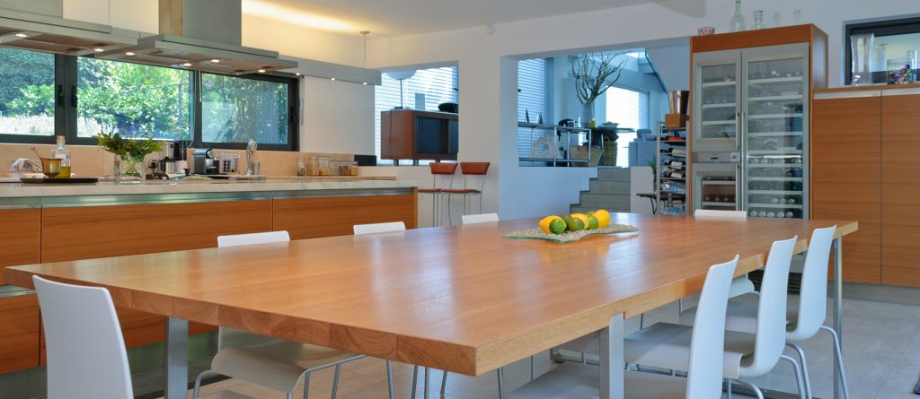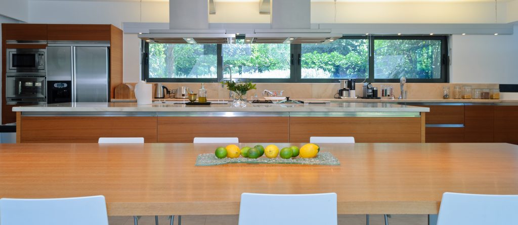 Ground floor. Main living room, with open fireplace and balcony. The upper living room has the same views at a higher elevation with a mezzanine bridge to its balcony. Well equipped kitchen with large terrace and pergola. Butler’s kitchen and utility room. Cloakroom. Staff entrance.