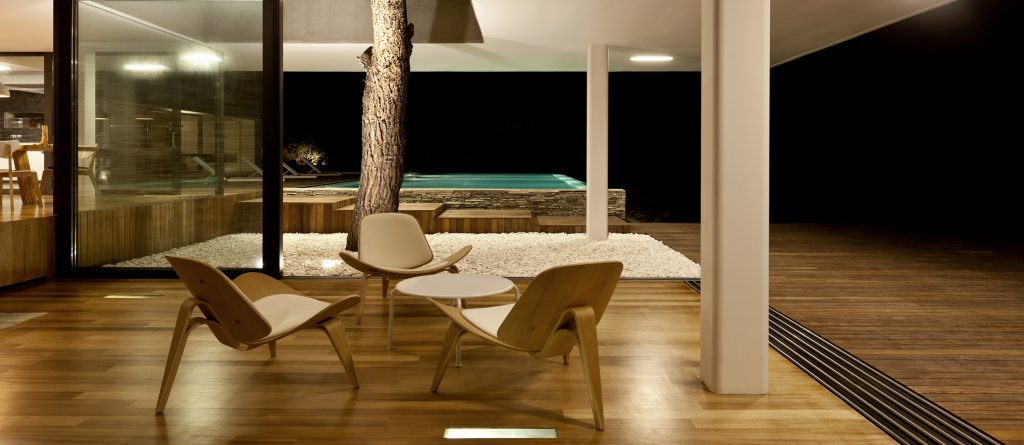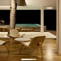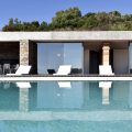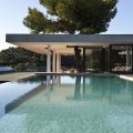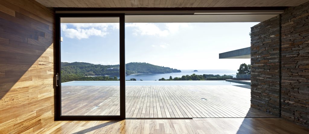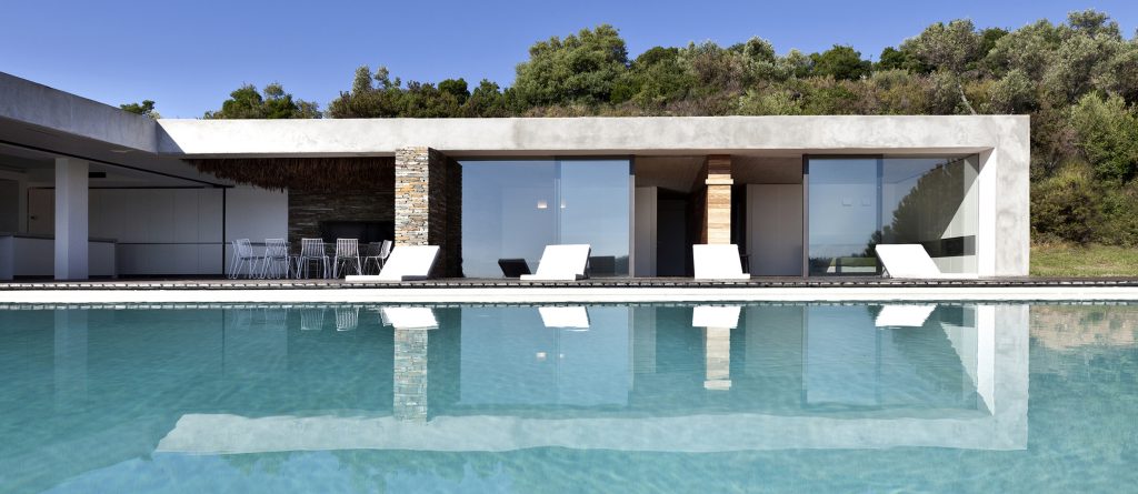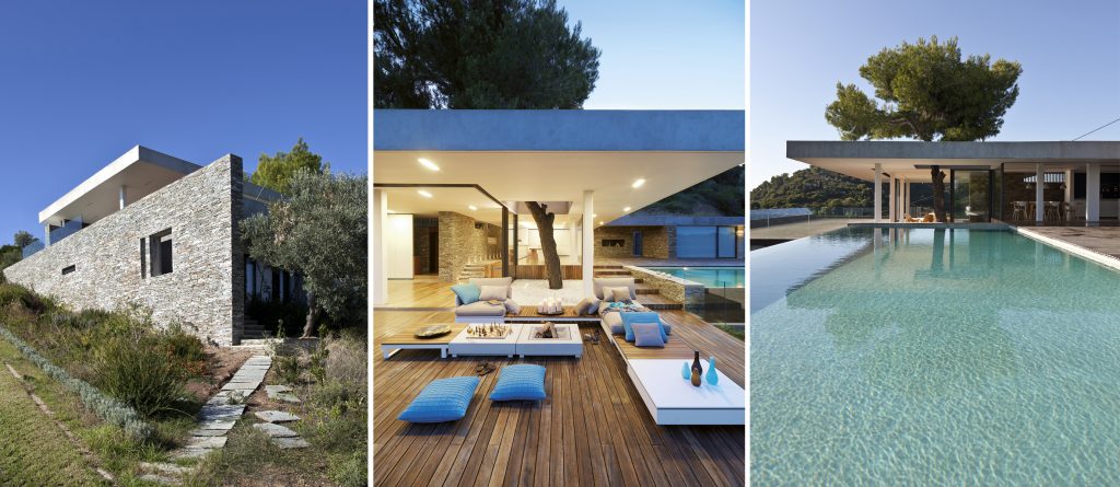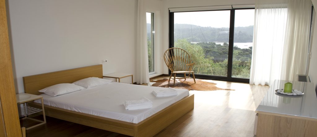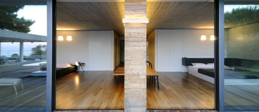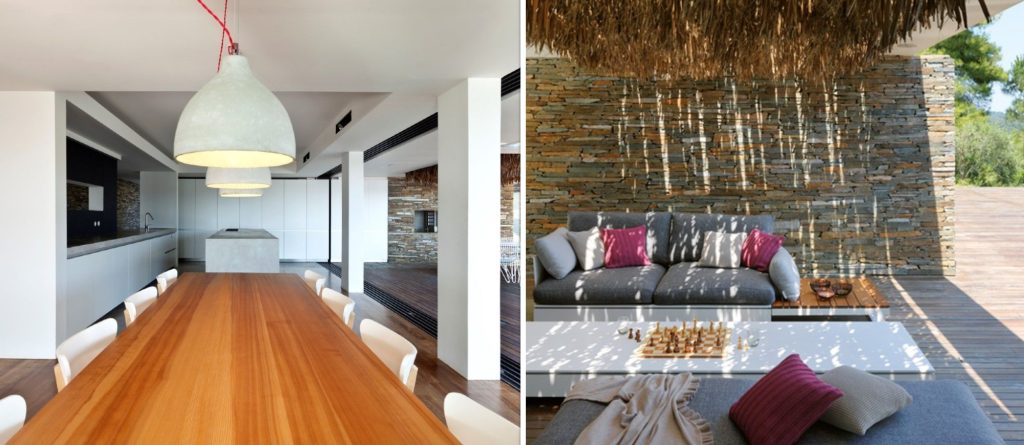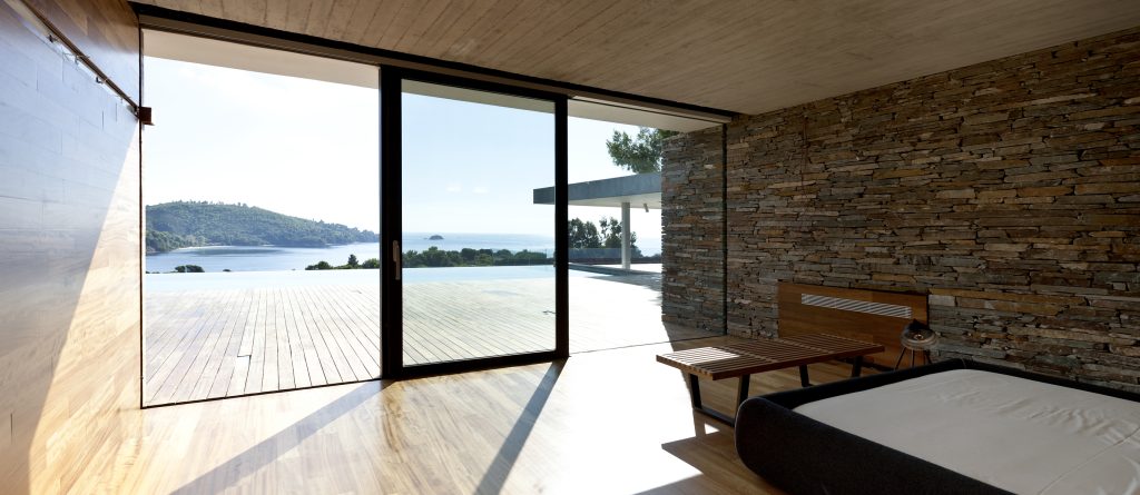 The interior of the villa, which is divided into two levels and has a total of six bedrooms, is the definition of classic modern and minimalistic. The glass windows offer panoramic views from every single room in the villa. These windows, slide opened, creating the unique sensation of being outside even when you’re protected under the cool shade of the villa. Also, the interior of this totally “green” villa is made of natural materials such as stone, wood and glass, creating a cozy atmosphere you will forever want to escape in. From there you can always indulge in unobstructed views of the sea as it continues from the edge of the pool.