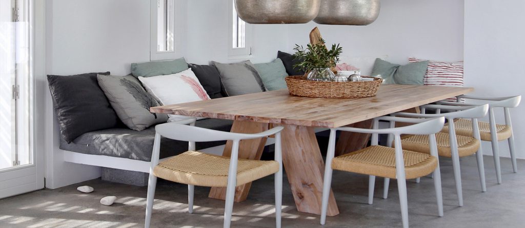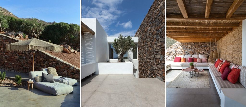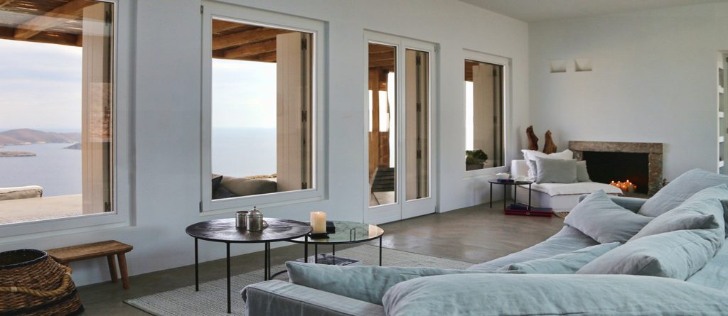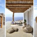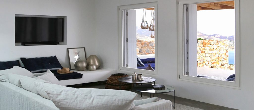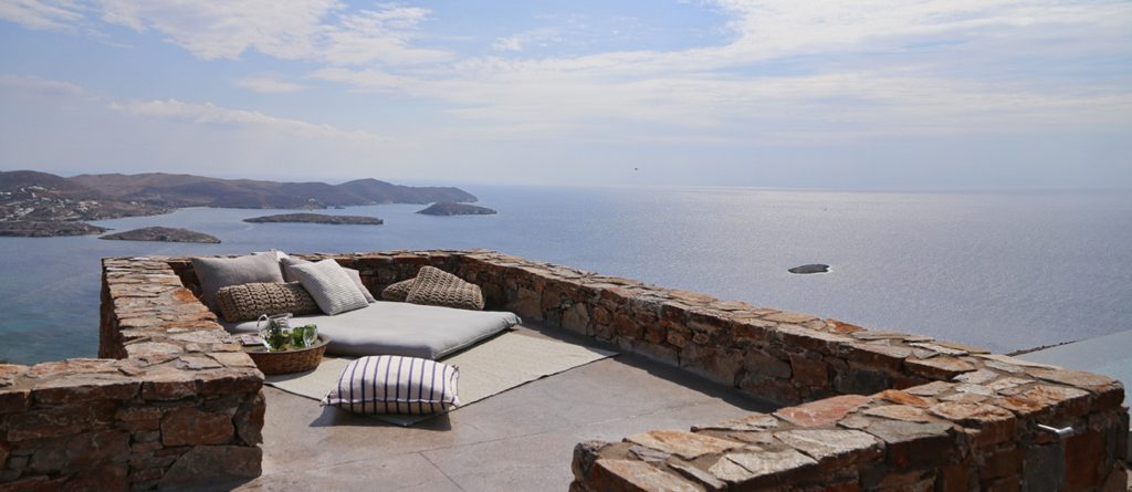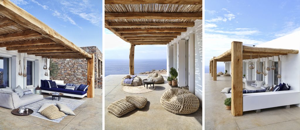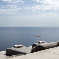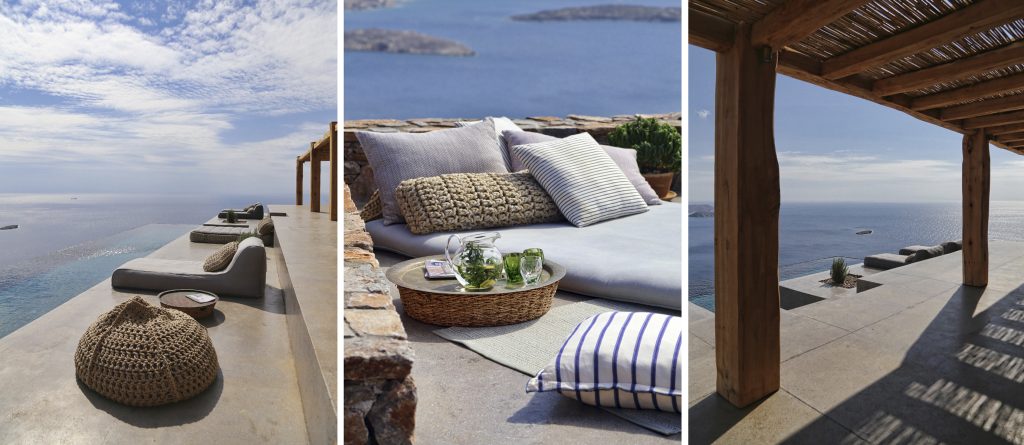 Conviviality and ultimate relaxation take place on the large outdoor terrace which resembles a compilation of scenes from a summer dream and at the same time embodies the essence of a luxurious summer. An infinity pool with infinite views, a fabulous sun terrace, various lounge and shaded sitting areas with fluffy cushions, carpets and fascinating decor, as well as a shaded hot tub and an outdoor gym. This is a perfect villa for large families or groups of friends looking for a peaceful retreat with fabulous amenities and the ultimate in Aegean surroundings.