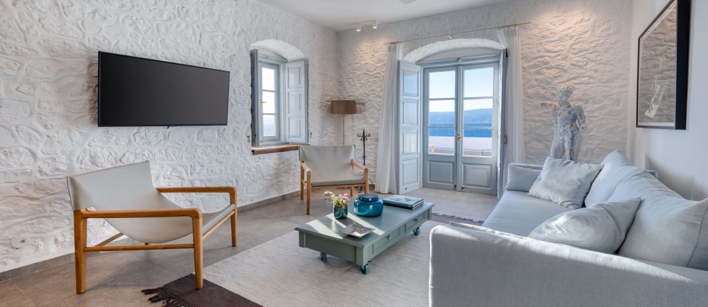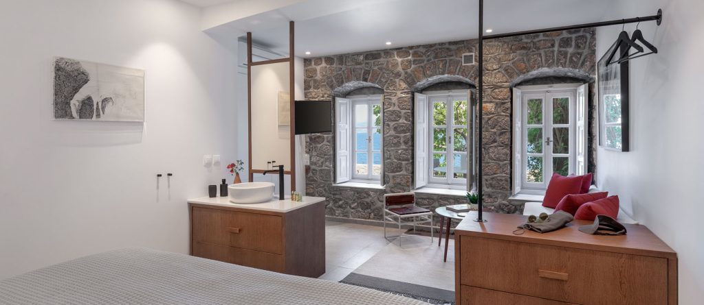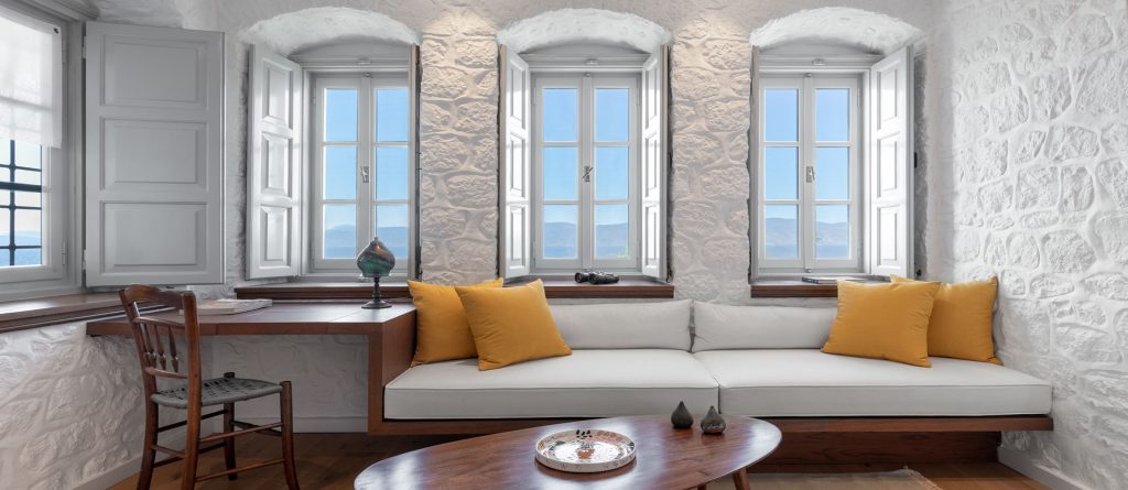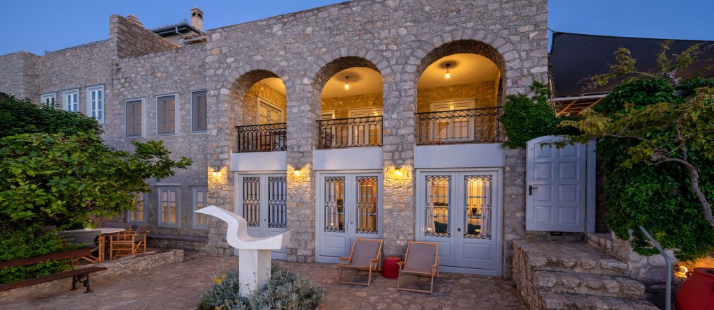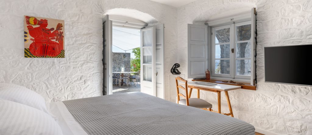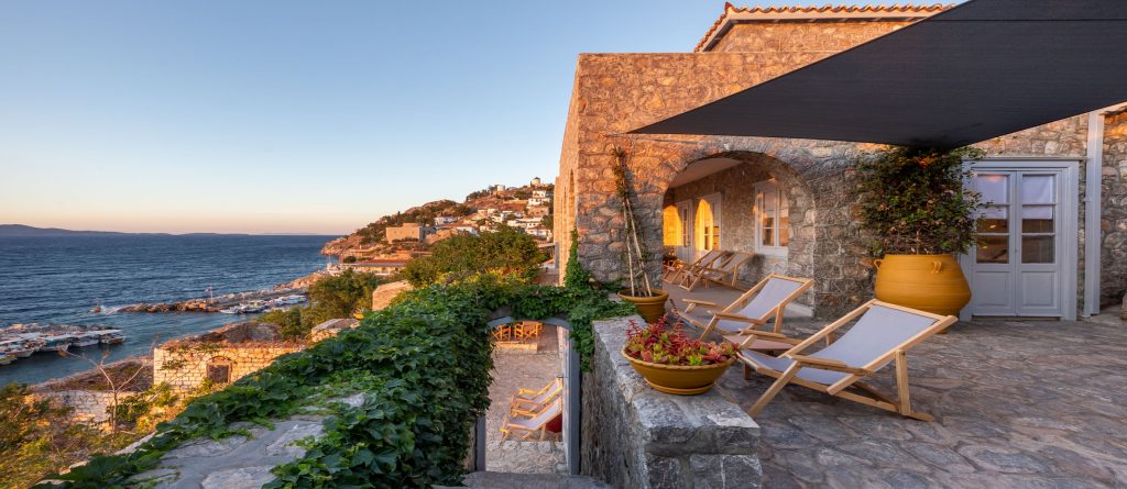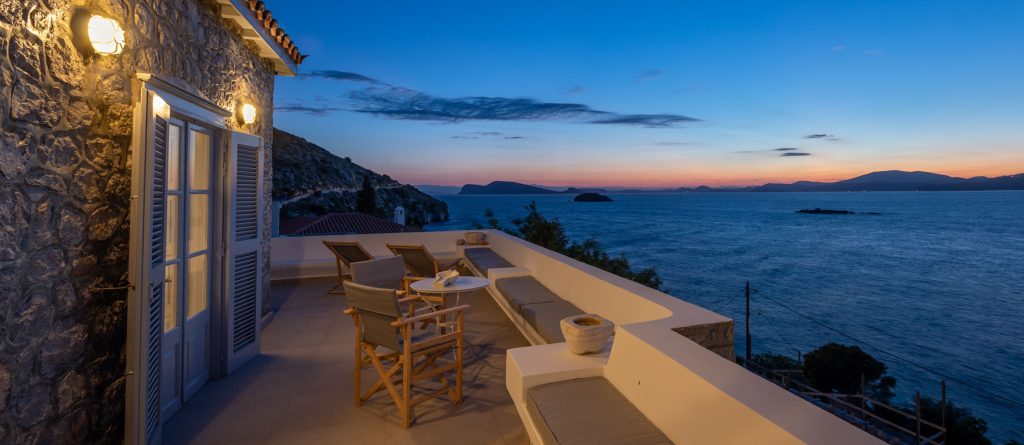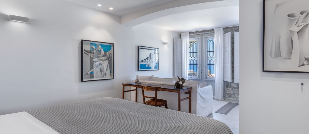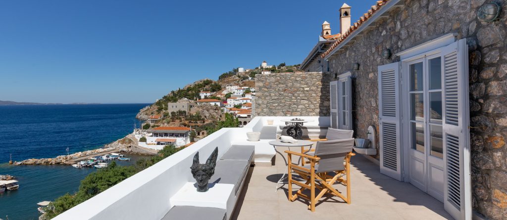 The property combines the charm of a traditional stoned house in Hydra with the personality of an art studio and the luxury of a premium modern home. It can be rented as a villa for larger groups or as separate suites, one on each level. Each level opens to a terrace with arty lounge & dining areas, ideal for a peaceful breakfast, sundowners or al-fresco dining overlooking the coast of the Peloponnese.