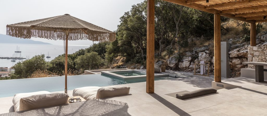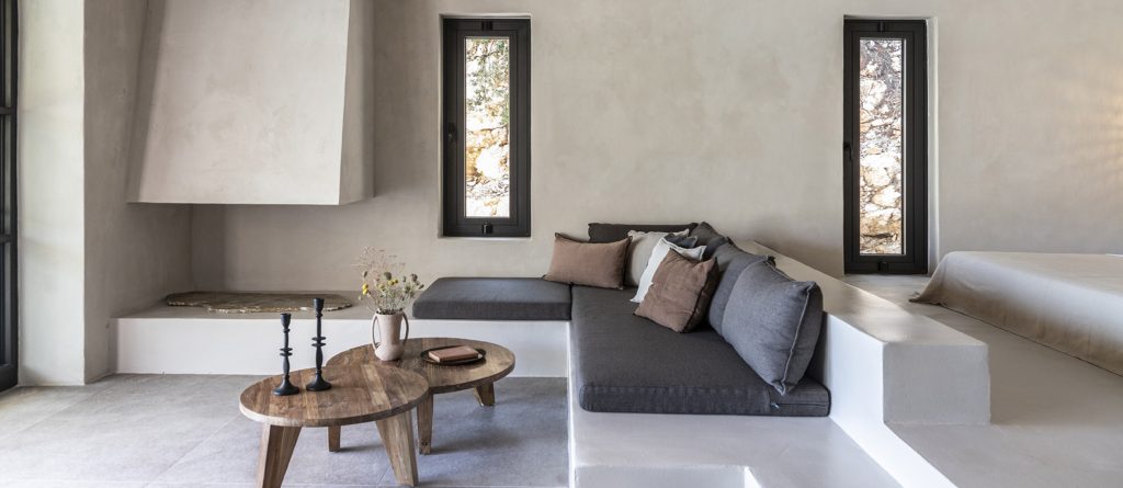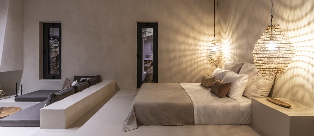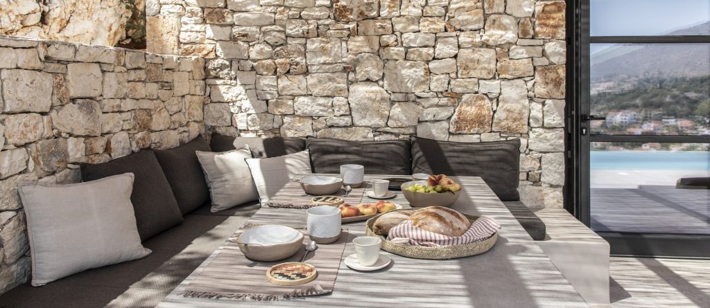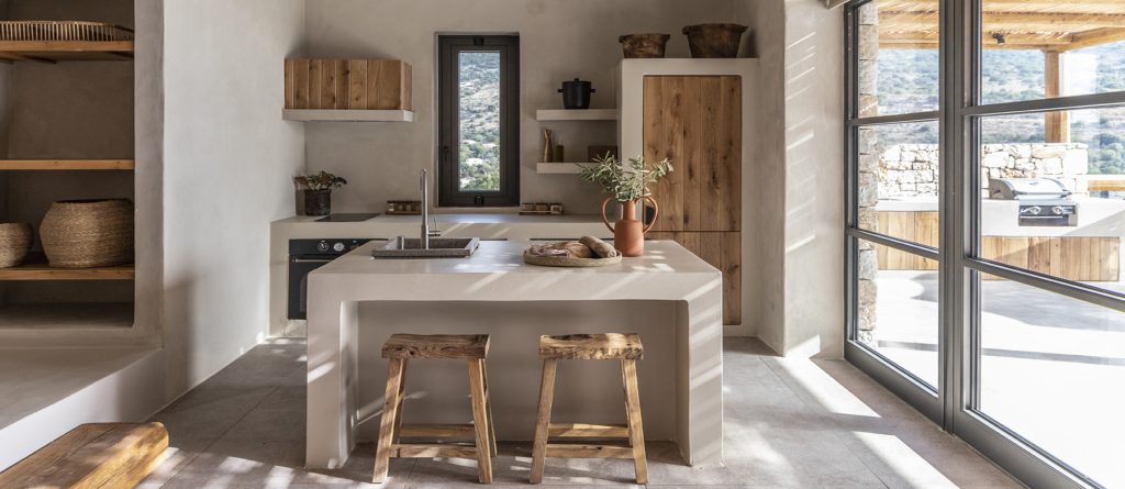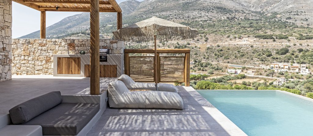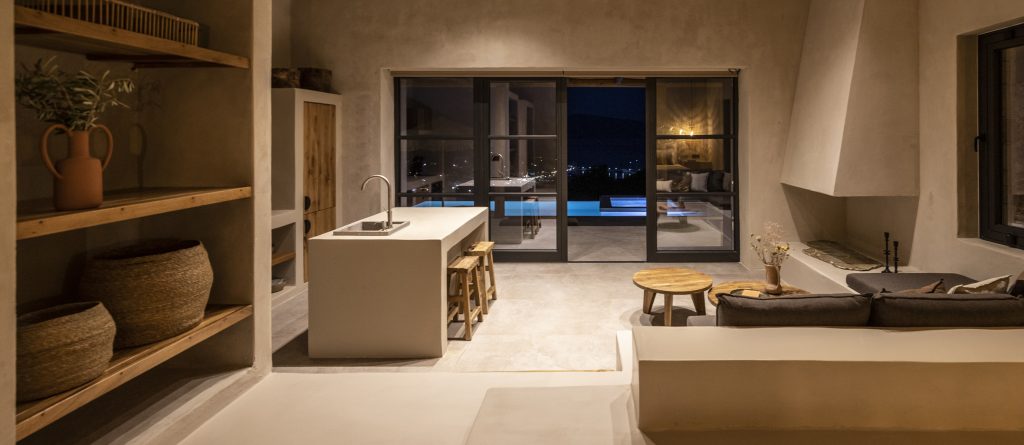 Designed with a modern and minimalist aesthetic, the big open spaces frame the island views from every room, while earthy brushstrokes complement the understated elegance of this luxurious stone villa.