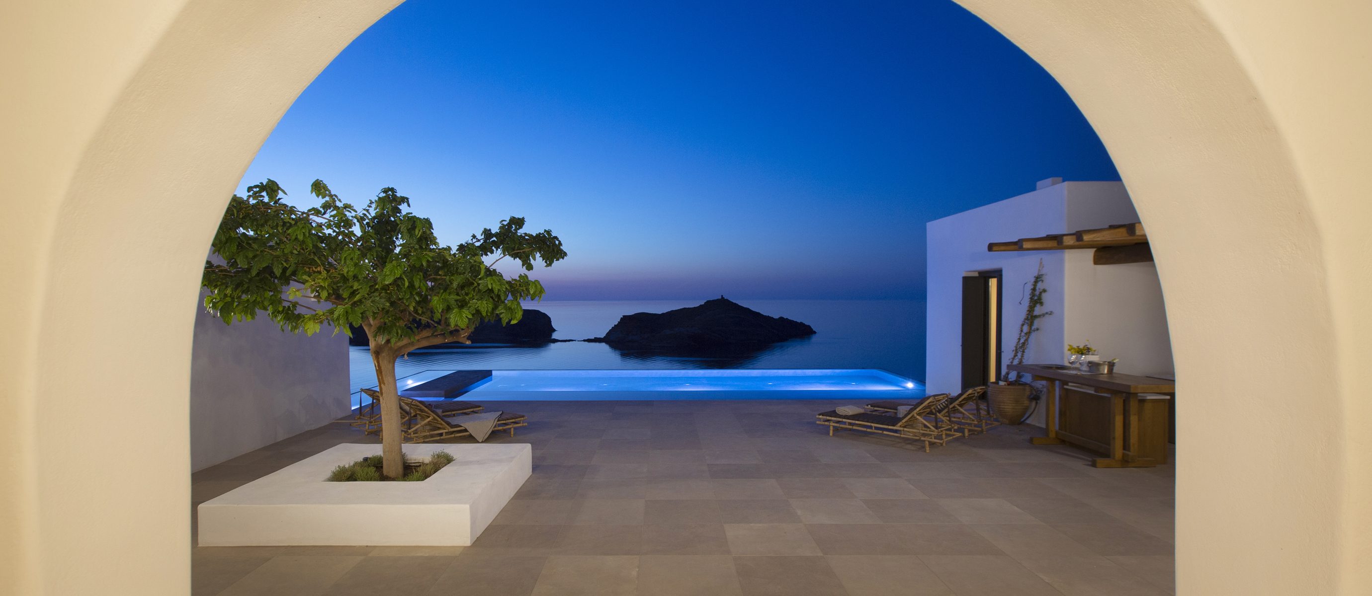 Elegant & cool. Located on a secluded slope on the northern coast, a blend of Cycladic and Moroccan architecture. Six bedrooms. Maximum occupancy: 12 guests. 4 kms from Panormos, 1 km from Rochari Beach.