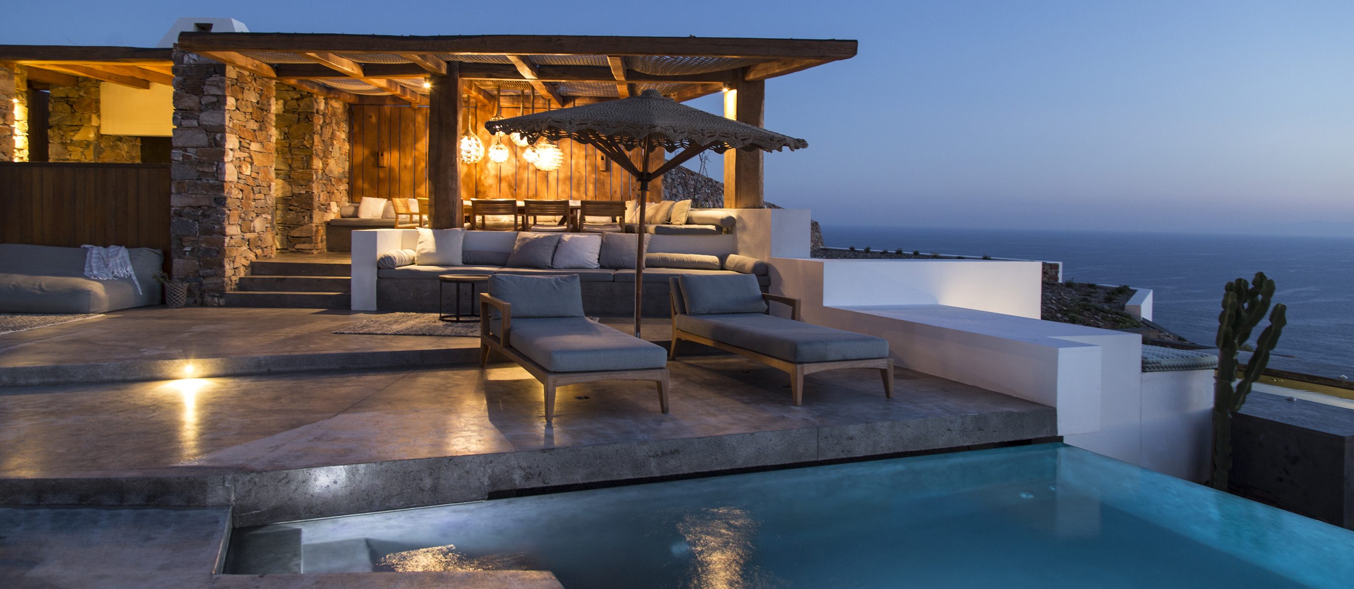 Stunning views over the Aegean from this very private hilltop property with state of the art technology. Nearest beach is Kokkina, 1.5 kms away. Five bedrooms, four bathrooms. Maximum occupancy: 10 guests. Infinity pool and jacuzzi. Outdoor gym.