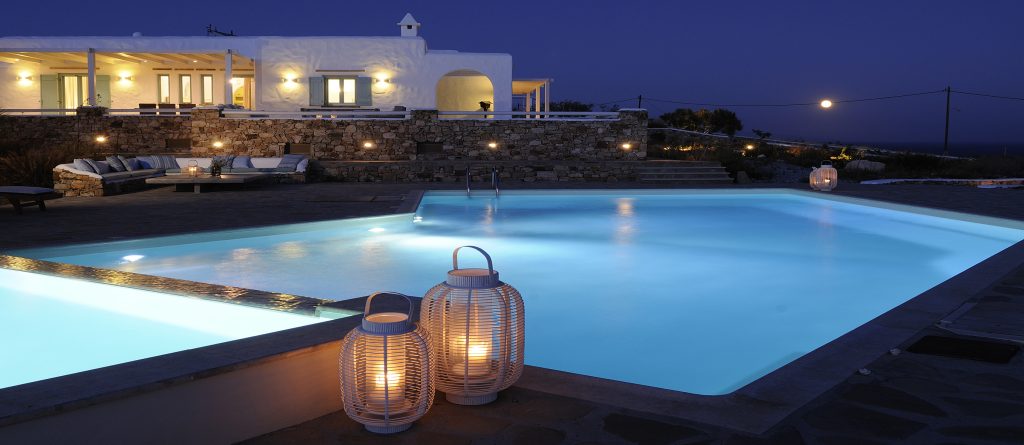 Children also enjoy the ping pong and the basketball in the pool. A small water cascade separates the children’s pool of 20 m2 from the big one which has a hydro massage. Around the pool, there are two built sitting areas with tables, comfortable sun beds and umbrellas. The small pool bar is equipped with a fridge & music system. You can always connect your smart phone and play your favourite  music even with air play IOS or Android.