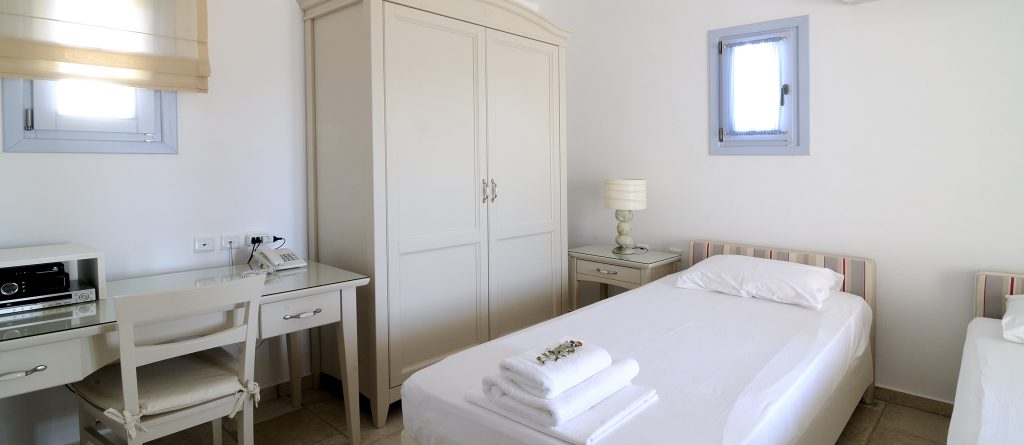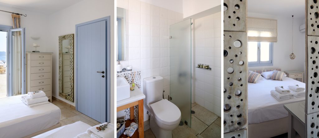- 2 double bedrooms en-suite; 1 bedroom with two single beds en suite. Sleep 6 people. All bedrooms have sea view, air condition, a French door with a screen sieve, bedside tables, desk/dressing table, wardrobe, drawers, sat TV, DVD player, safe box, telephone, Internet.