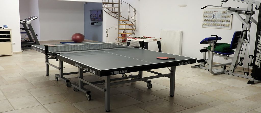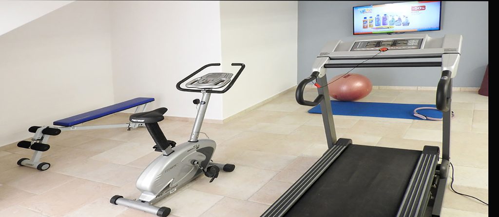 - Gym area (electric gym runner, magnetic bicycle, multi-use equipment for 30 types of exercises using weights, abdominal bench, gym mat, Pilates ball, step and ping pong (table with racquets) and