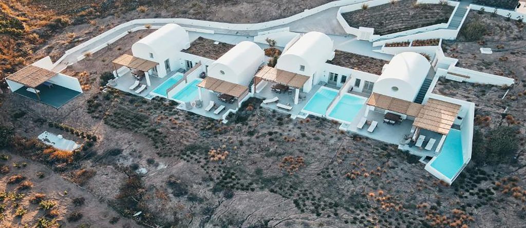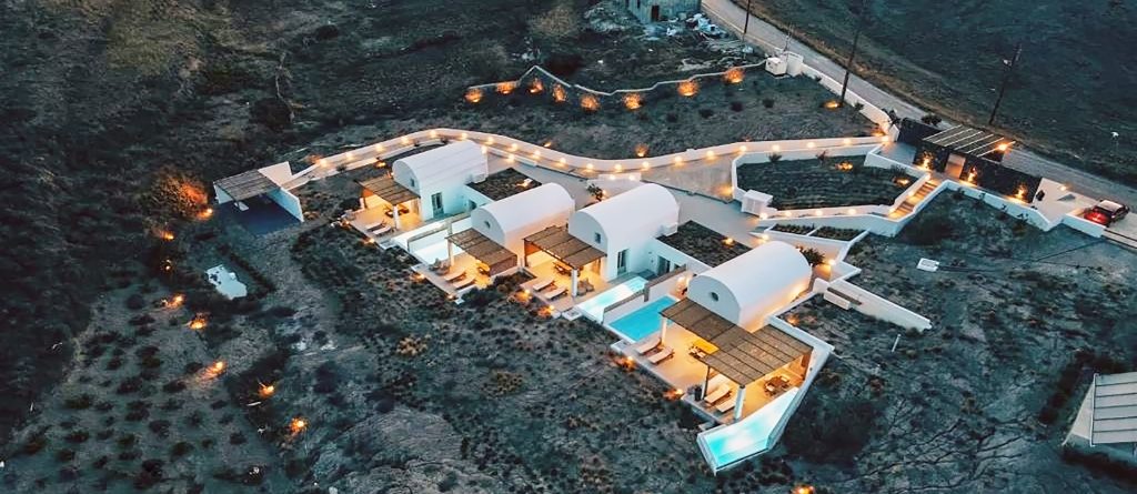 Located right in the middle of the island of Santorini, though not far from the popular areas of the island, Thera Villas is a newly built complex of five private villas, each one with a private pool. Drawing from the inherent qualities of its ambiance, these villas unfold in an area of 5 acres rich in aromatic plants, vines, and olive trees.