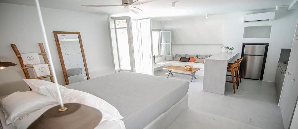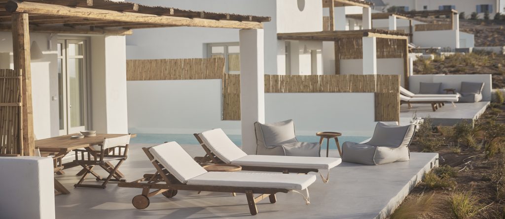 The suite enjoys an area of 40 sq.m. and accommodates 2 persons, with the possibility for 1 more. It features an open space master bedroom, a fully equipped kitchen, a living room/sitting room, a bathroom with shower, and patio furniture. The suite has access to a private outdoor swimming pool.
