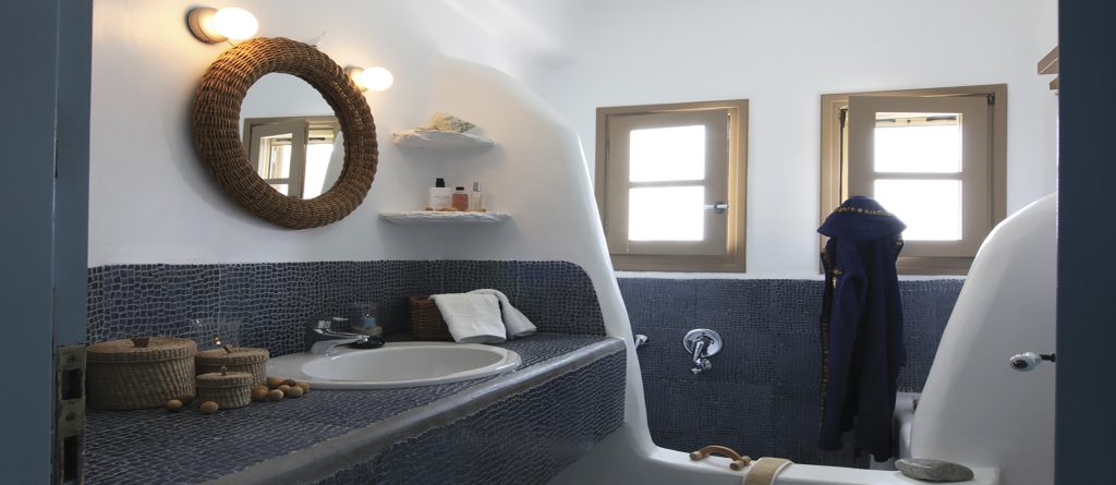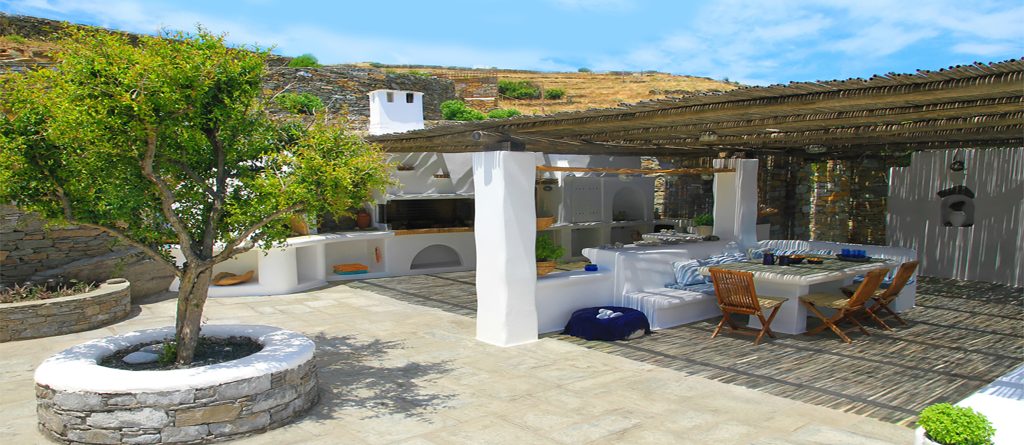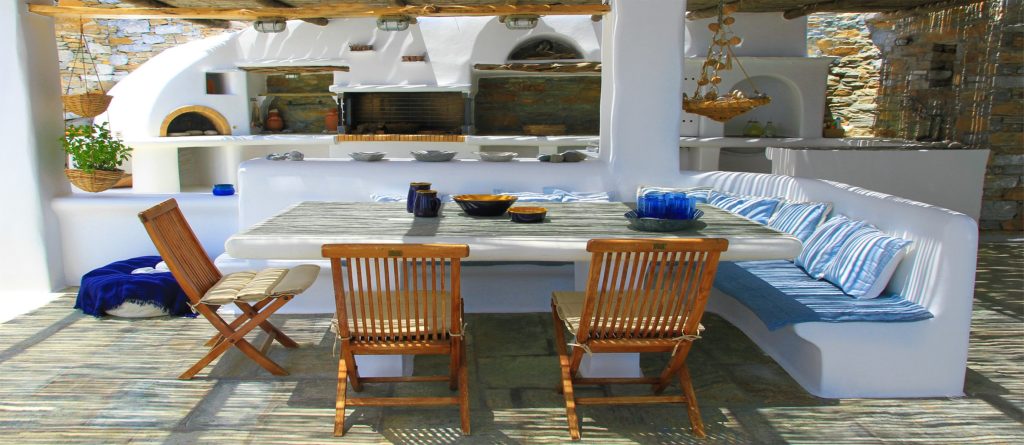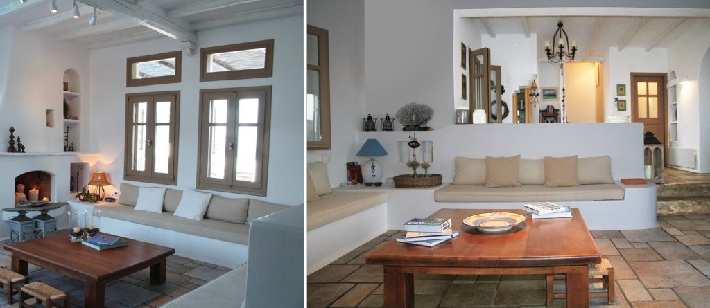 The exterior area is designed in such a way that someone can enjoy every moment of the day, depending on the sun position or the wind direction. At the courtyard, you’ll find a BBQ next to a shaded dining area, for eating outdoors with your friends or family. There is plenty of space for lounging by the private seawater pool (4.5x11m), and for those who would enjoy a more adventurous dive, the sea is located a few stairs away from the house.