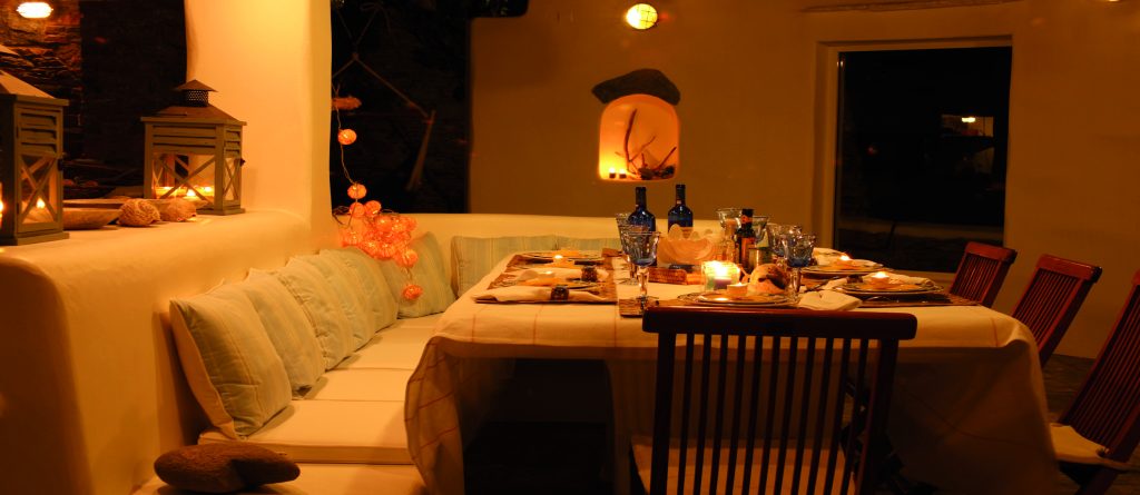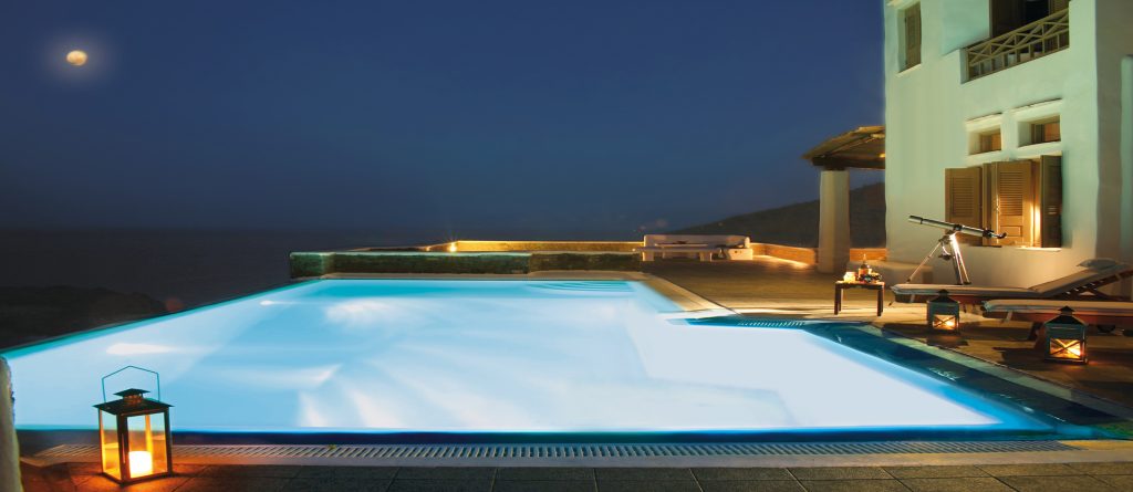During the evening, the exterior lighting of Villa Thermia, and the view of the stars, or the full moon create the ideal summer vibe. A lovely, little chapel completes this outstanding scenery with its bright white colour, illuminated by the distinctive spotlight around it.