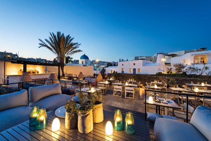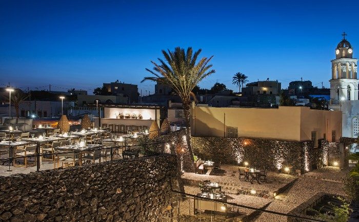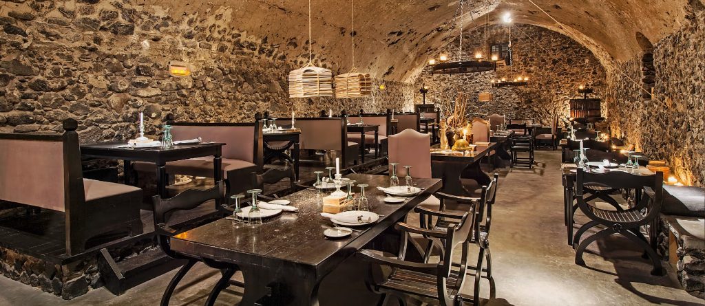 While outdoor dining in the upper terrace, with elements and motives inspired by the Greek summer and expressed in a modern and elegant way, is open to the star gazing with views to the rolling vineyards and the traditional village of Megalohori. The menu consists of fresh fish from the Aegean sea, accented with farm-to-table ingredients that the island is known for, yet always with a refined touch…