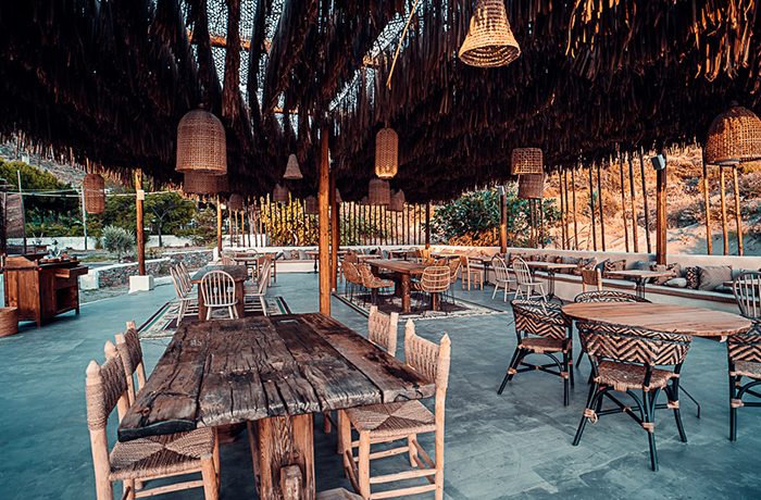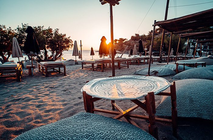 At one of the beach locations on Kythnos offering uninterrupted views across the open sea, horizons of blue mix with yellows, golds, and pinks born of the generous sun. Be it a chilled gathering of friends or a day of contemplative, creative solitude, our beach is a sublime retreat. A few dozen wooden cabanas and sunbeds, elegant in their simplicity, blend discreetly with their natural surroundings.