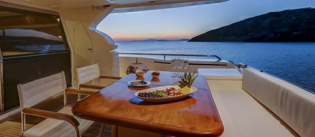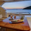 “ A brilliant combination of comfort & style, & space, she provides a ample dining area in her interior saloon as well as an aft deck dining table for those who enjoy al fresco dining & for a change of scenery a breakfast table on her sundeck to wake up to a unique sunrise whilst enjoying a freshly made breakfast , served by one of her crew members.