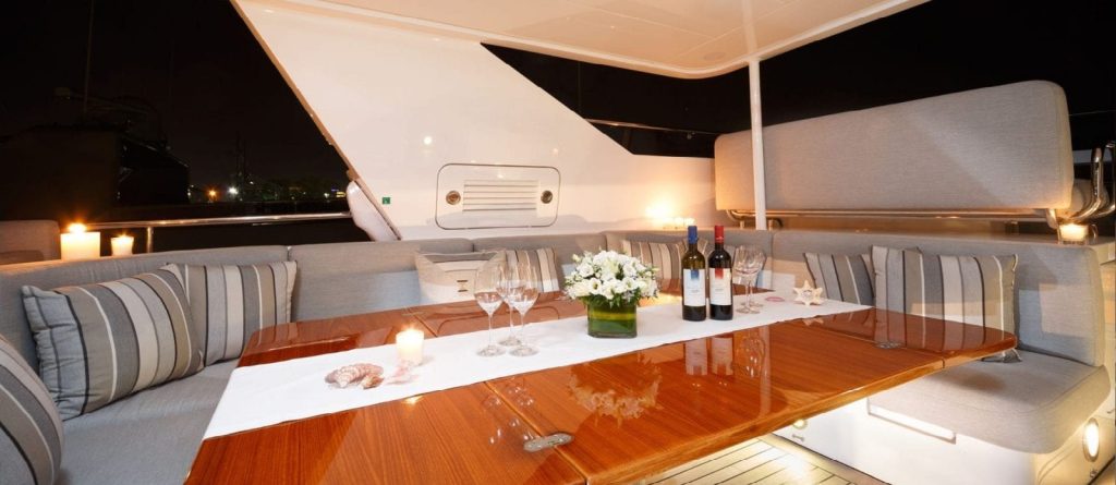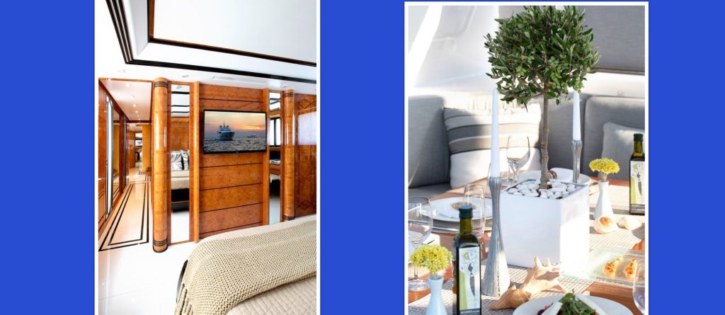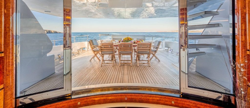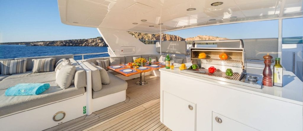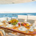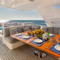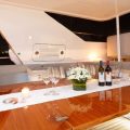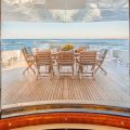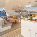 Inside the yacht, the comfortable lounge adjoined to the spacious dining area is the perfect place to relax while enjoying a panoramic view of the sea. In dialectical relationship with the interior, the two-level deck is equipped with dining and lounge areas, suited for round table gatherings, relaxing, or simply enjoying the endless view of the horizon.